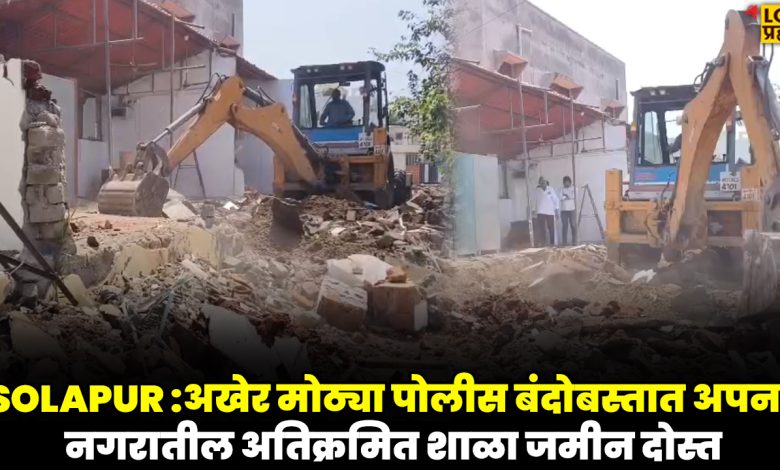 सोलापूर : सोलापूर महापालिकेच्या अतिक्रमण विभागाने शहरातील अतिक्रमणांवर सुरू केलेल्या मोहिमेअंतर्गत आज (शनिवार) नई जिंदगी परिसरातील नवजीवन शाळेवर अतिक्रमण विरोधी कारवाई करण्यात आली. या कारवाईदरम्यान पोलिसांचा मोठा बंदोबस्त ठेवण्यात आला होता.