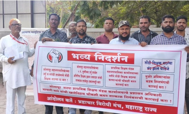 सोलापूर महानगरपालिका अंतर्गत उर्दू व मराठी प्राथमिक शाळांमध्ये सुरू असलेल्या कथित बेकायदेशीर तोंडी शिक्षक बदल्या, पदांचा दुरुपयोग व मनमानी कारभाराच्या निषेधार्थ भ्रष्टाचार विरोधी मंचच्या वतीने जिल्हाधिकारी कार्यालय, जिल्हा परिषद पुनम गेट येथे तीव्र निदर्शने व घोषणाबाजी करण्यात आली.