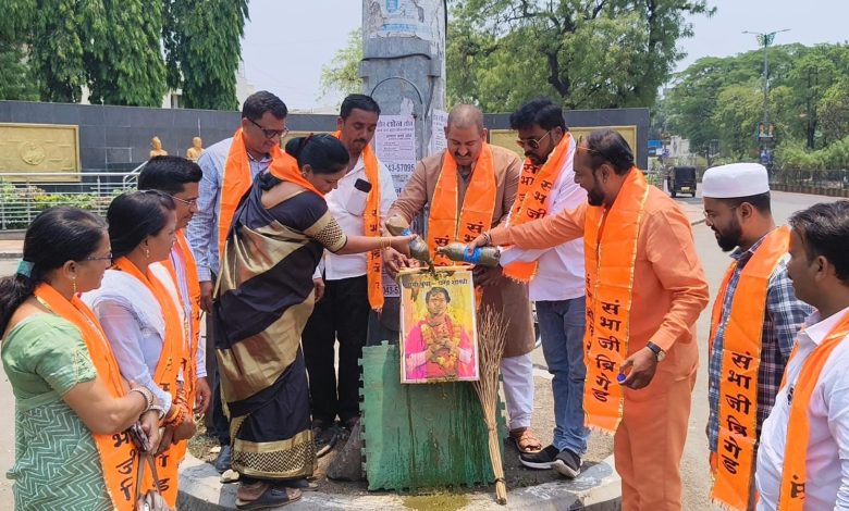 छत्रपती शिवाजी महाराज यांच्या बद्दल आक्षेपार्ह विधान करणाऱ्या बागेश्वर येथील धीरेंद्र शास्त्री याच्या प्रतिमेस चार हुतात्मा चौकात संभाजी ब्रिगेडच्या वतीने शेणाच्या अभिषेक घालून निषेध करण्यात आला.