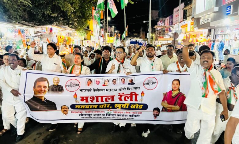 सोलापुरात मतदान चोरी विरोधात काँग्रेसची मशाल रॅली ; ‘मतदान चोर, खुर्ची सोड’ घोषणांनी सोलापूर दणाणले